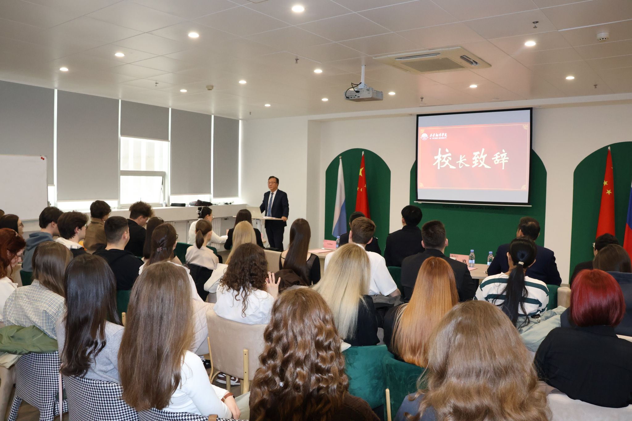 春和景明启新程,逐梦西译向未来。3月19日下午,西安翻译学院2026春季留学生开学典礼隆重举行。西安市公安局出入境管理局一级警长刘羽、四级警长崔玖,副校长郭炜,统战部长、党委宣传部部长邱杰,国际交流与合作处处长、国际交流学院院长王明明出席典礼,留学生课程负责人邓晶,留学生管理老师马姝芬,以及本次春季学期,来自俄罗斯友好高校的40位交换生齐聚一堂,典礼由王明明主持。