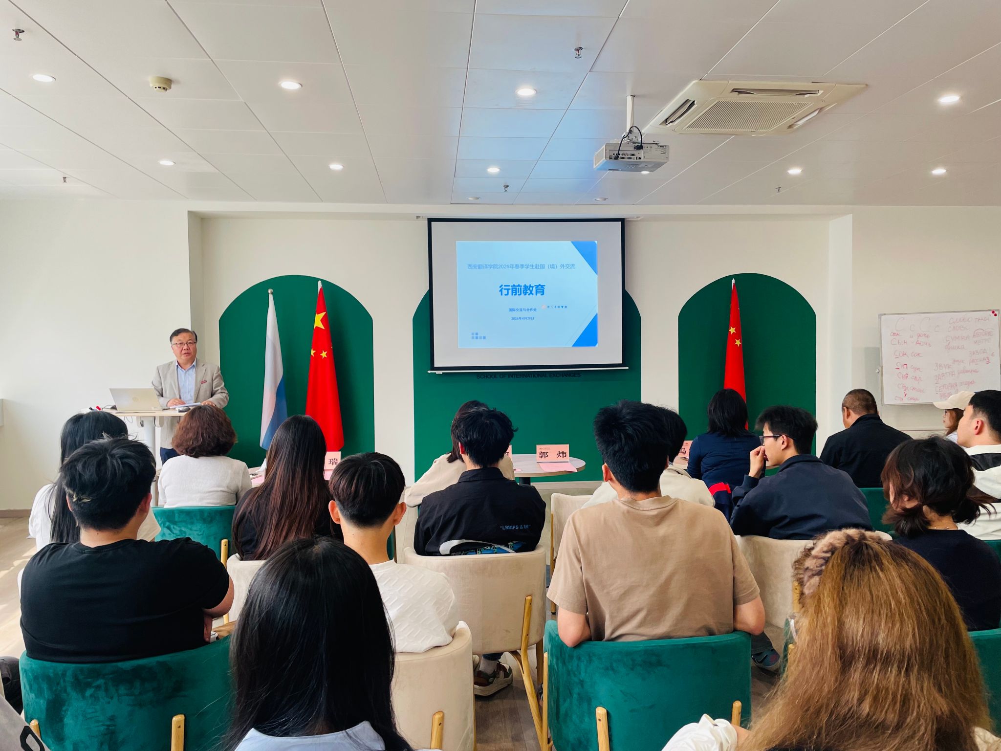 4月29日下午,2026年春季学生赴国(境)外交流行前教育会顺利举行。副校长郭炜、国际交流与合作处处长王明明、人文与艺术学部带队教师王钰莹、经济与管理学部带队教师马桢、英文学院带队教师党建雄、国际语言文化学院教师代表蒋敏及国际处相关业务负责人出席会议。会议由王明明主持。